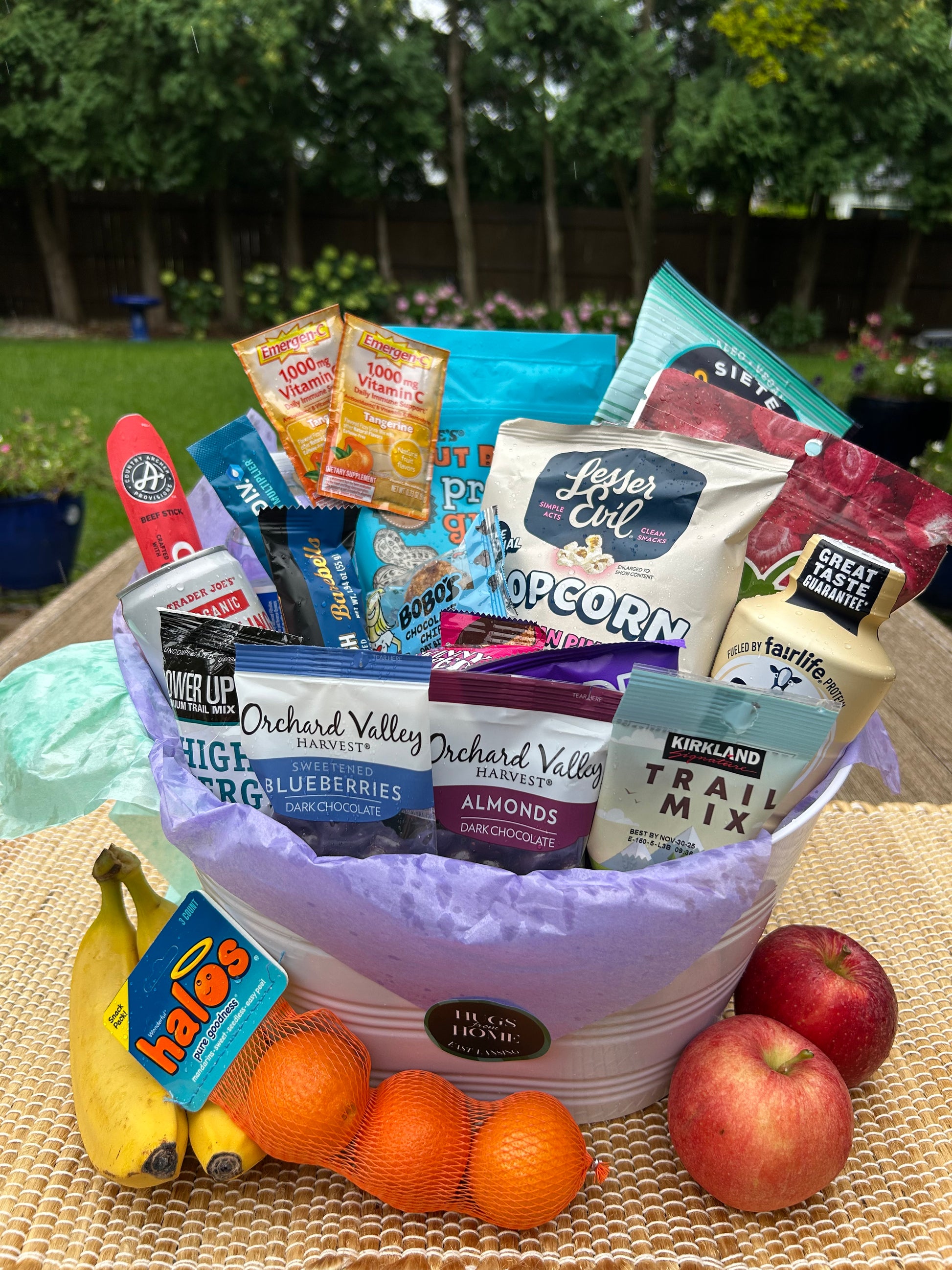 Includes wholesome favorites such as: water, Liquid IV, Emergen-C, probiotic drinks, Core Power Shake, Barebells protein bar, beef stick, protein granola, protein oatmeal, dried fruit, fresh fruit, trail mix, nuts, dark chocolate blueberries & almonds, Skinny Dipped dark chocolate peanut butter cup, Lesser Evil Popcorn, Siete Chips, Made Good mini bites, Bobo Oat Bites, etc.